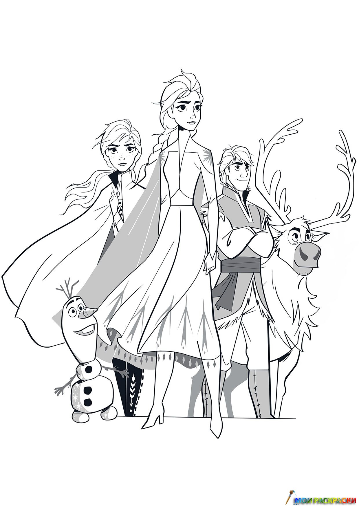 Раскраска Эльза, Анна, Кристоф, Свен и Олаф