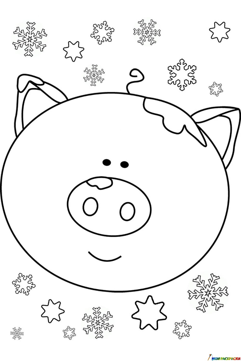 Раскраска Красивая хрюшка со снежинками