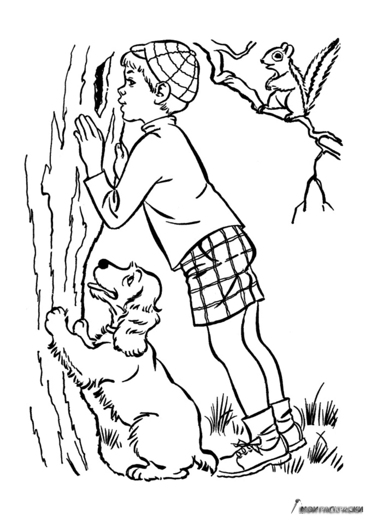 Раскраска Собака, мальчик и белочка