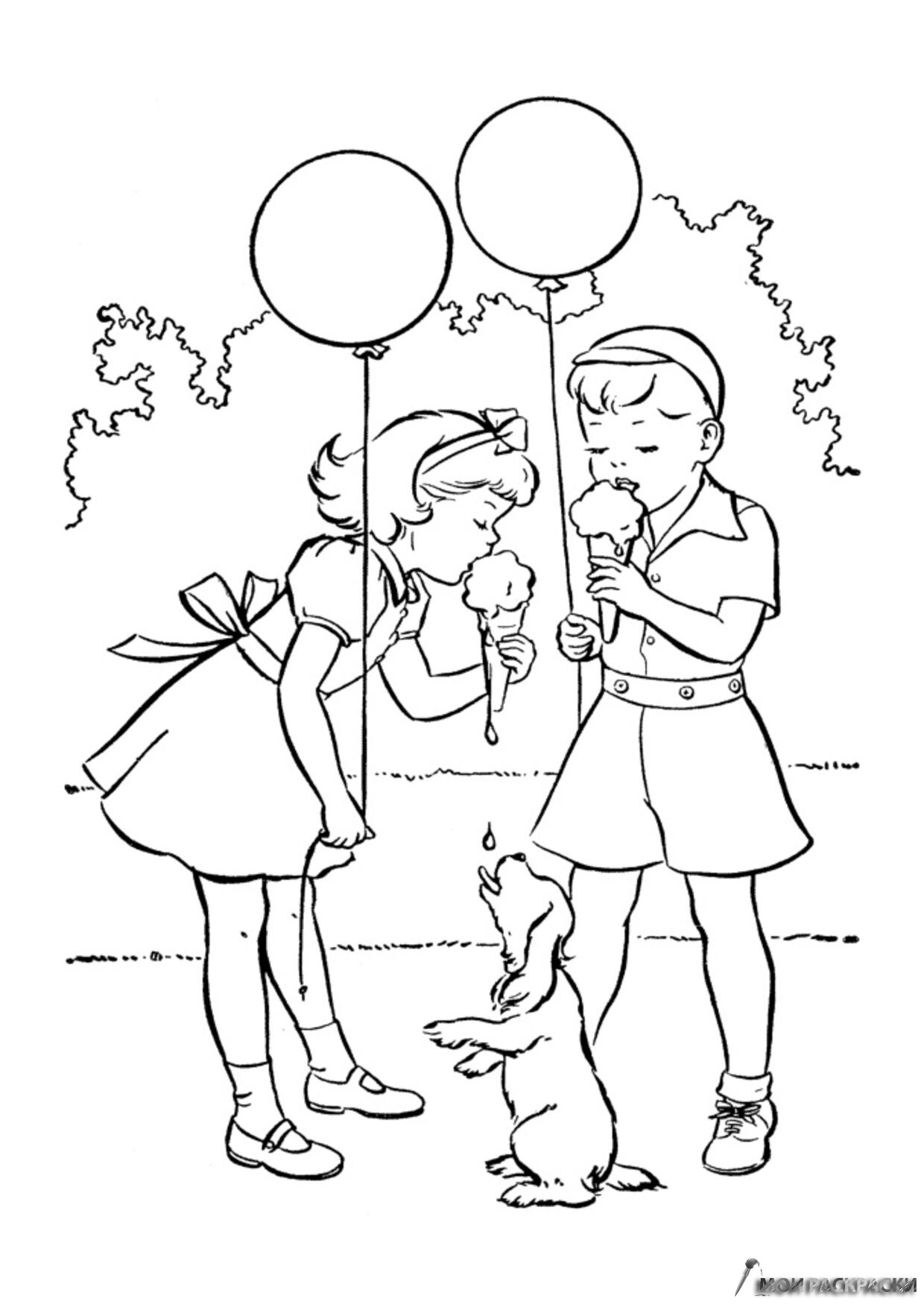 Раскраска Собака пытается кушать мороженое
