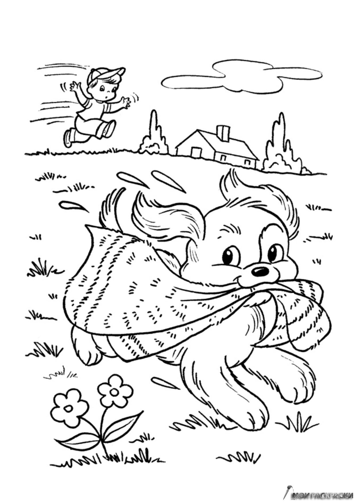 Раскраска Собака схватила полотенце