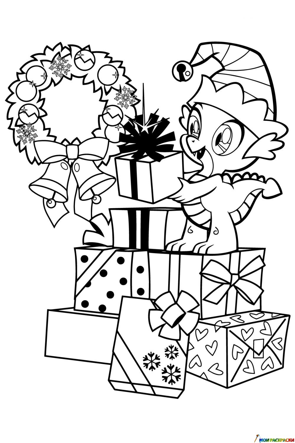 Раскраска Спайк и новогодние подарки