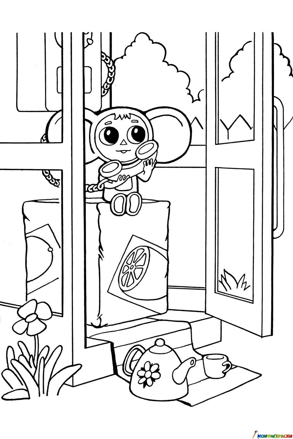 Раскраска Жизнь Чебурашки в телефонной будке